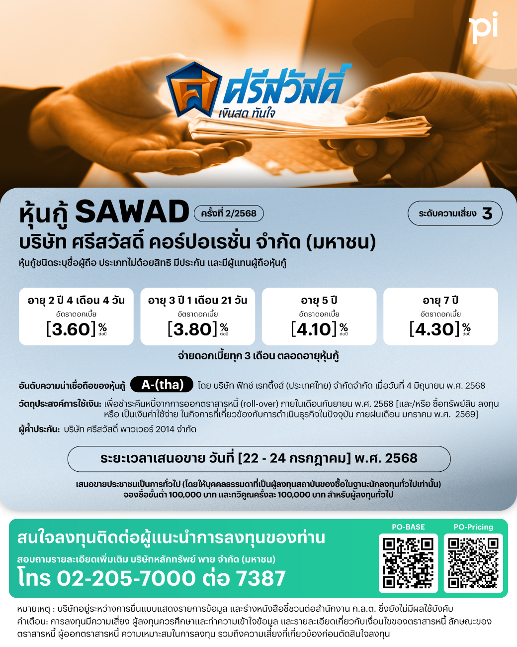 SAWAD- บริษัท ศรีสวัสดิ์ คอร์ปอเรชั่น จำกัด (มหาชน) คาดเสนอขาย หุ้นกู้ชนิดระบุชื่อผู้ถือ ประเภทไม่ด้อยสิทธิ มีประกัน และมีผู้แทนผู้ถือหุ้นกู้ ครั้งที่ 2/2568 ชุดที่ 2