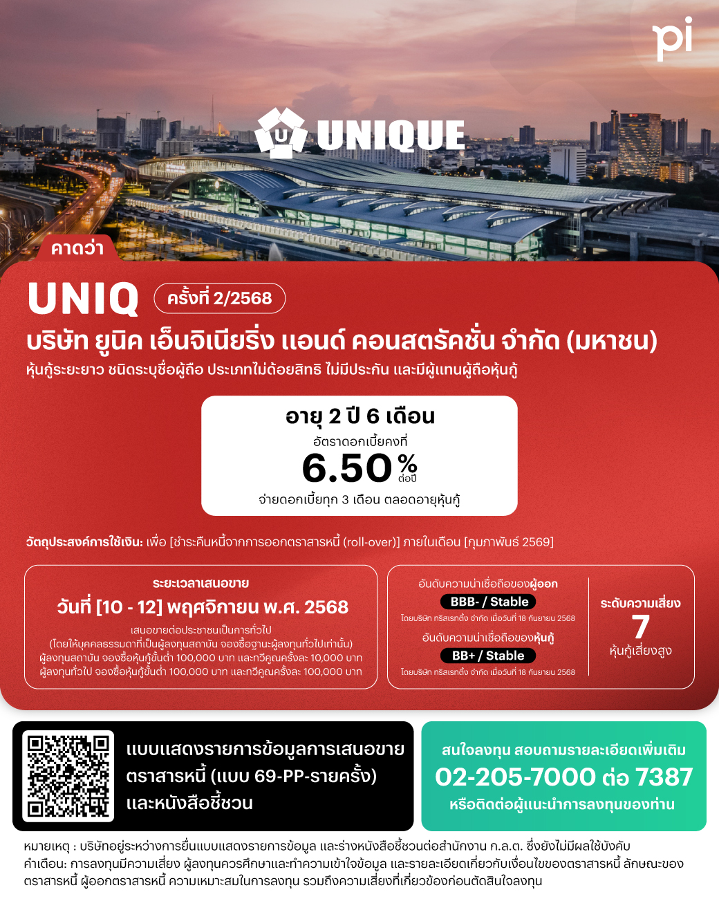 UNIQ- บริษัท ยูนิค เอ็นจิเนียริ่ง แอนด์ คอนสตรัคชั่น จำกัด (มหาชน) คาดเสนอขายหุ้นกู้ระยะยาว ชนิดระบุชื่อผู้ถือ ประเภทไม่ด้อยสิทธิ ไม่มีประกัน และมีผู้แทนผู้ถือหุ้นกู้ ครั้งที่ 2/2568
