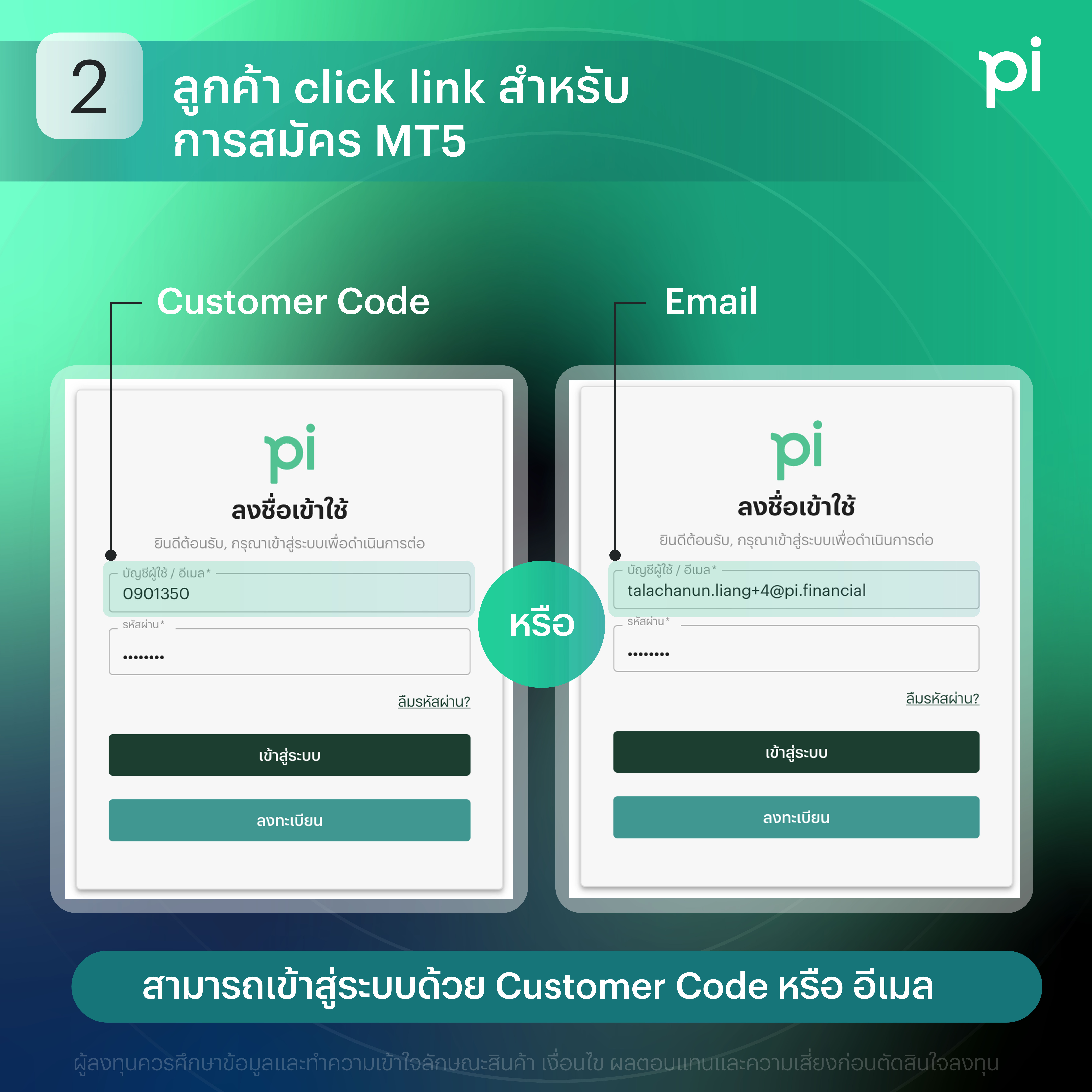 1. ลูกค้า Pi เข้าสู่ระบบด้วย Customer Code หรือ E-mail ที่เคยลงทะเบียนเปิดบัญชีไว้กับ Pi เรียบร้อยแล้ว