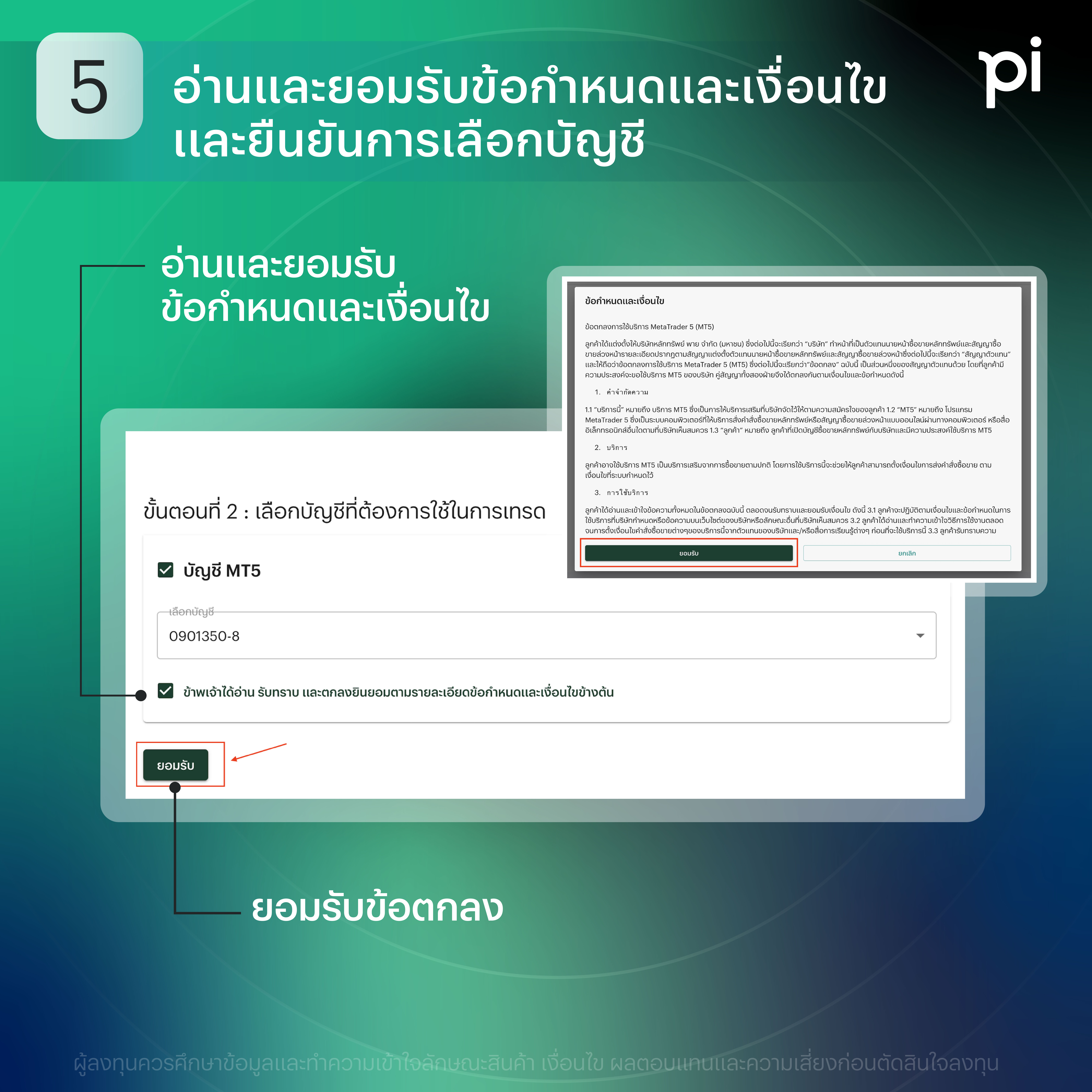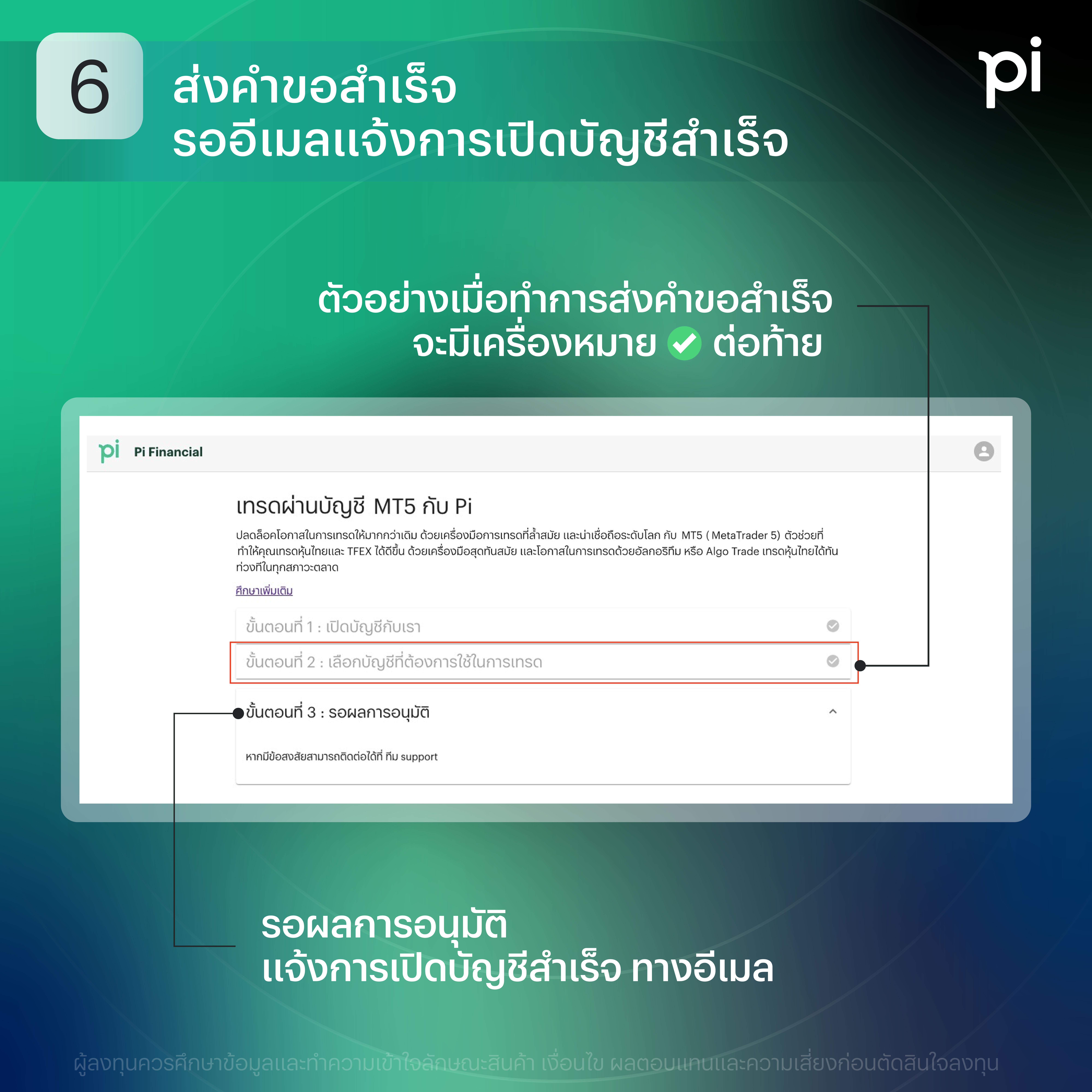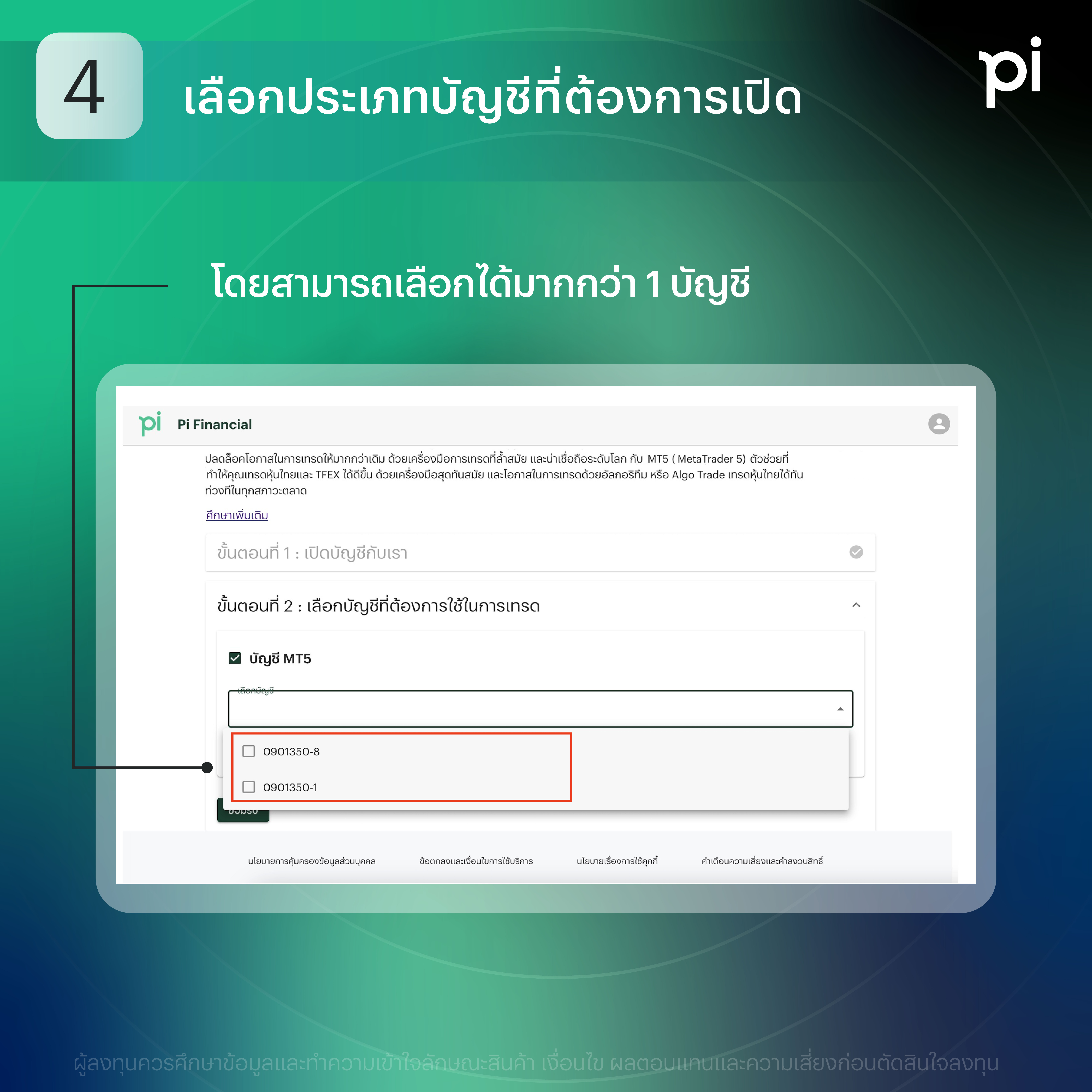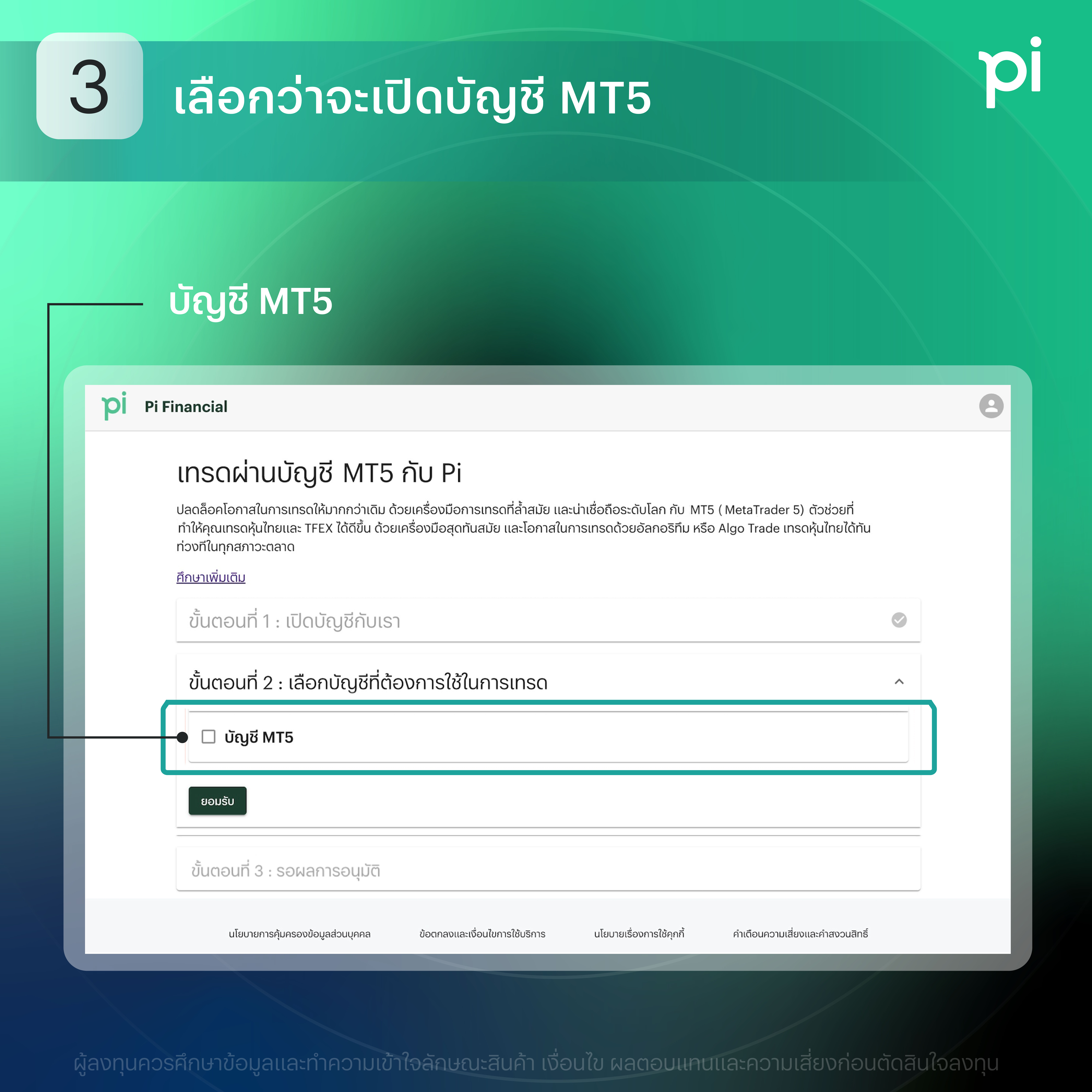 ข่าวดี! เฉพาะลูกค้า Pi เท่านั้น วันนี้คุณสามารถเปิดบัญชี MT5 เพื่อเทรด หุ้นไทย TFEX และ CME Group ตราสารอนุพันธ์ระดับโลก ได้ด้วยตัวเองแล้ววันนี้ง่ายๆ ทางออนไลน์ ไม่ว่าจะอยู่ที่ไหน เมื่อไร ก็เปิดบัญชี MT5 กับ Pi ได้ง่ายเพียง 6 ขั้นตอน เท่านั้น