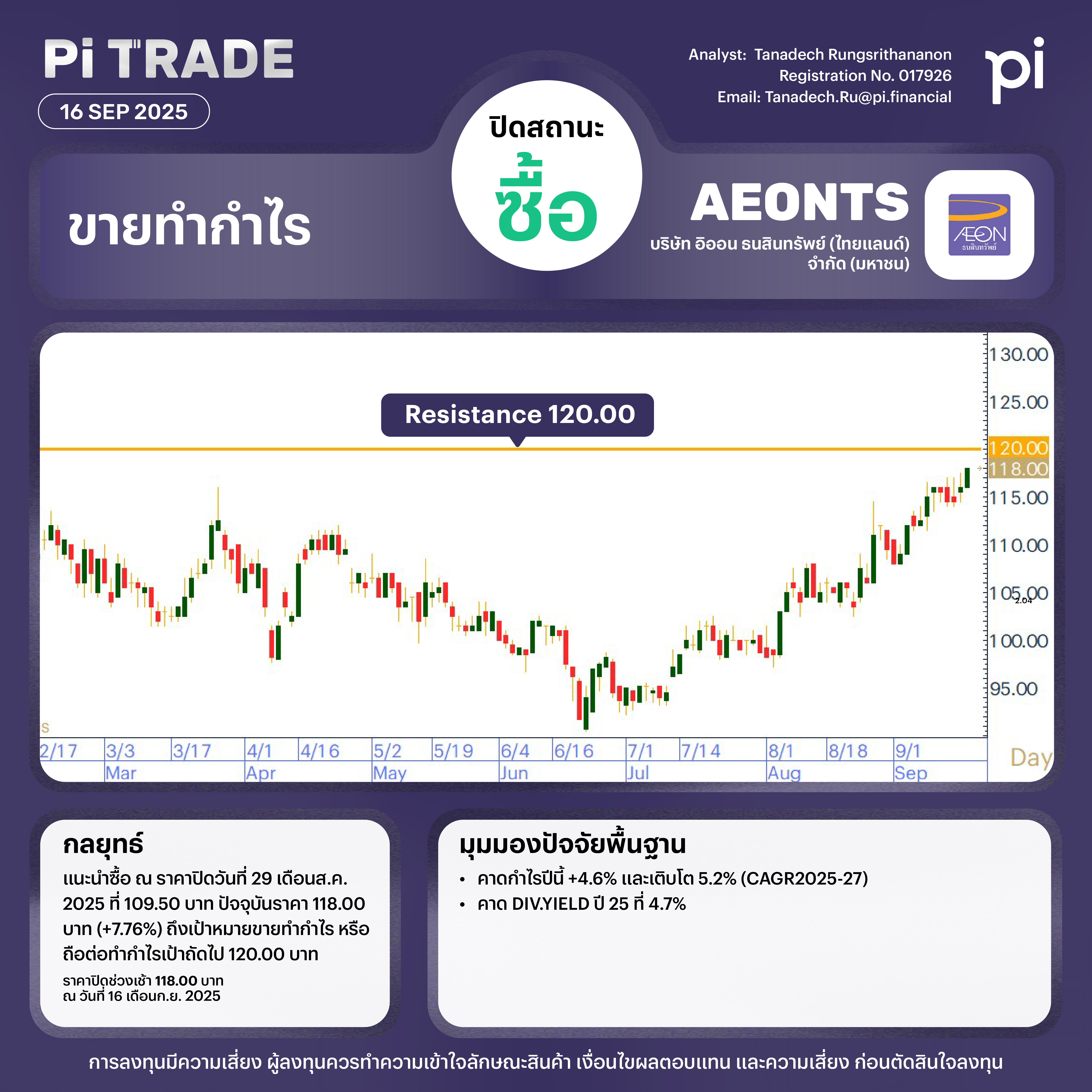 แนะนำซื้อ ณ ราคาปิดวันที่ 29 เดือน ส.ค. 2025 ที่ 109.50 บาท ปัจจุบันราคา 118.00 บาท (+7.76%) ถึงเป้าหมายขายทำกำไร หรือถือต่อทำกำไรเป้าถัดไป 120.00 บาท